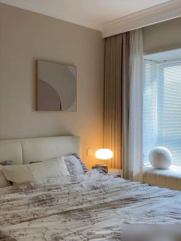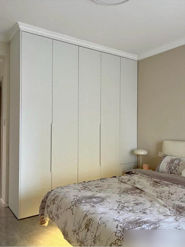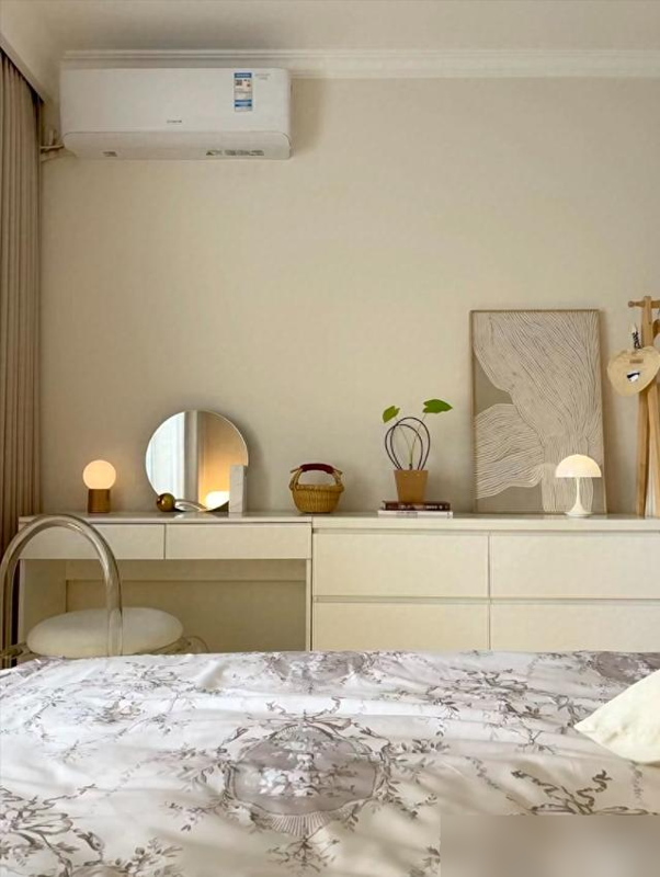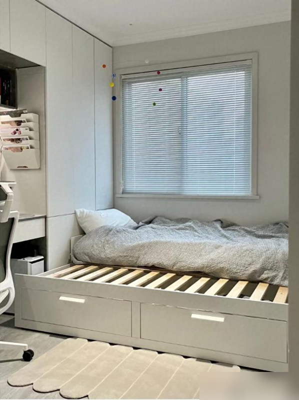 奶茶色墙面配通顶衣柜,没线条装饰反而显层高;次卧榻榻米底下藏抽拉柜,换季被褥冬装全镇压。