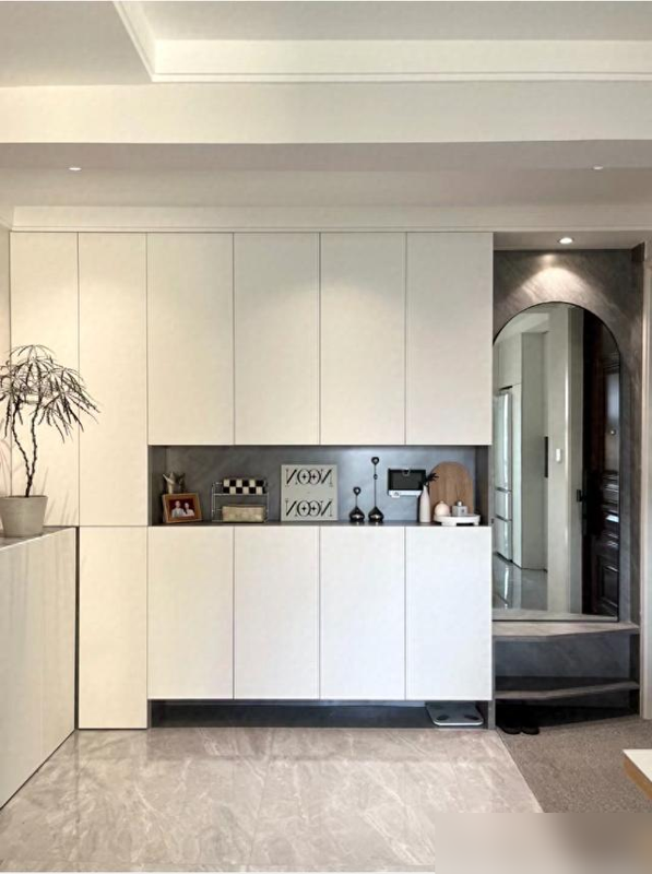 玄关整面墙的鞋柜顶天立地,打开像变形金刚肚囊,全家杂物往里一塞,门一关世界清净——这才是中年家庭的刚需啊。
