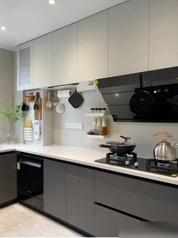厨房岩板台面是真心机,水渍油污一抹就光溜;洞洞板把铲勺调料挂上墙,台面空出来切菜备餐,转个身都带风。