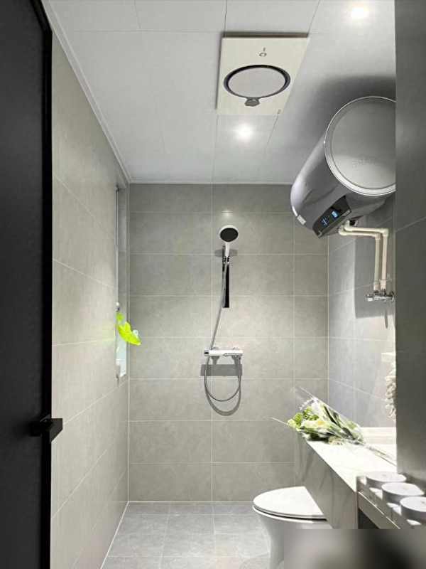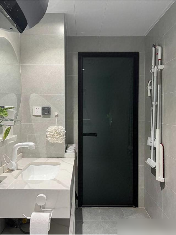 卫生间淋浴区用玻璃隔断,干湿分离做得滴水不漏,岩板一体盆根本不给水垢藏身的机会。